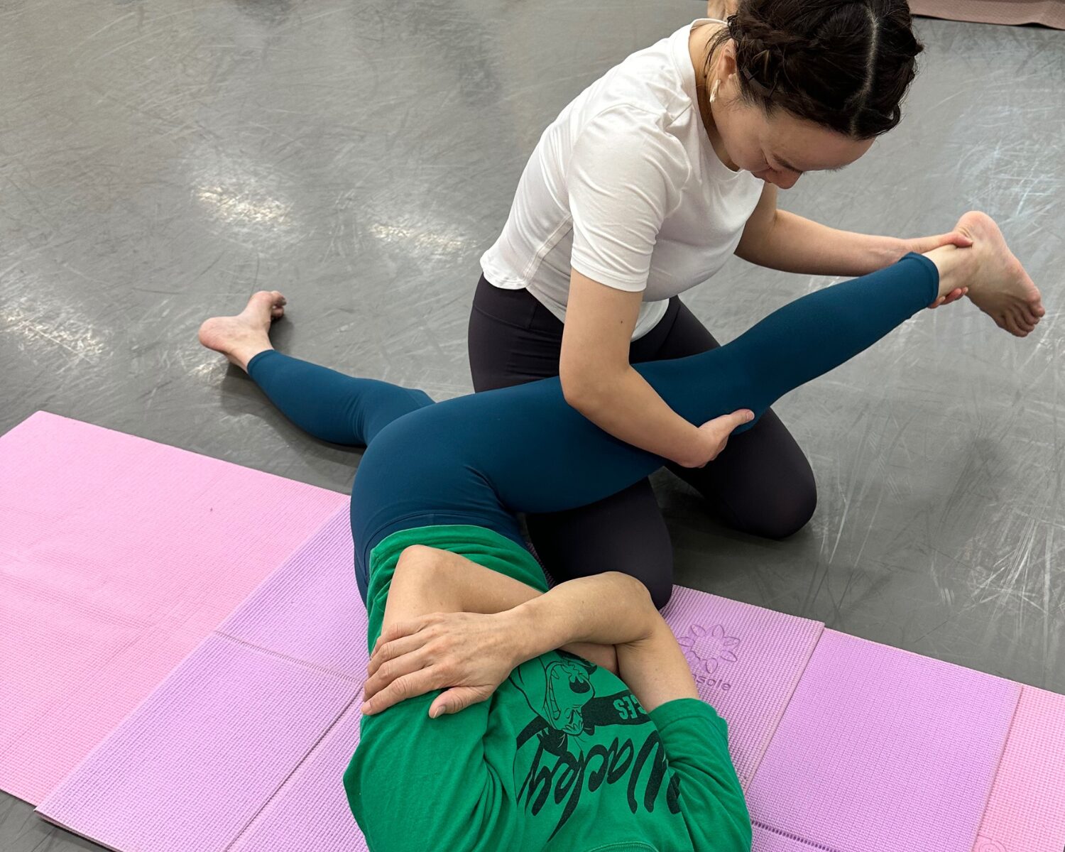 ①ヨガマットに寝ていただき足先から順番に背中の癒着を剥がしたら肩関節の位置を調整していきます。